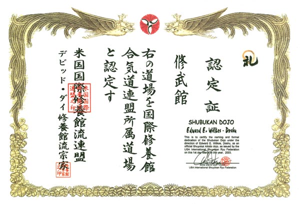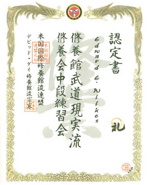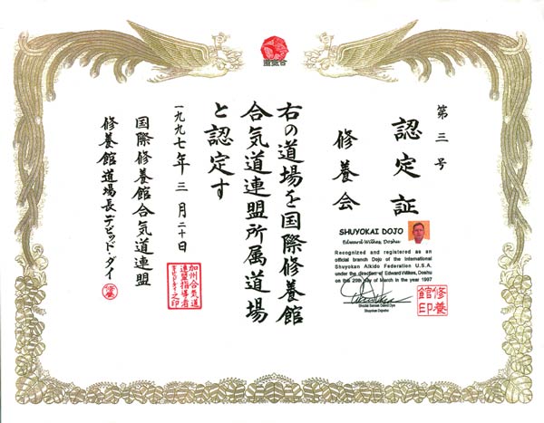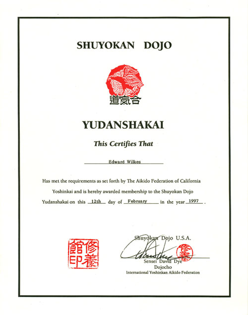 Membership in the Shuyokan Dojo Yudanshakai, Feb 12, 1997