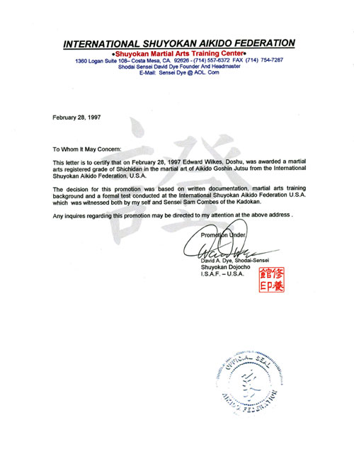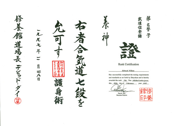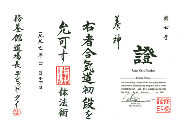 Certificate - Shodan, Aikido Tai-Ho Jutsu, Feb 12, 1997