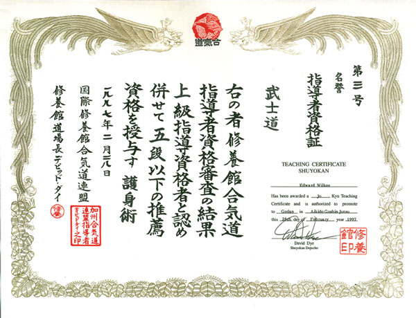 Jo Kyu Teaching Certificate, Aikido Goshin Jutsu, Feb 28, 1997