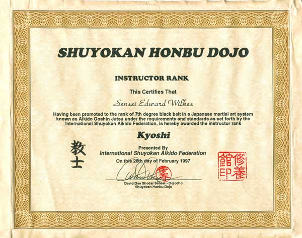 Kyoshi Instructor Rank, Aikido Goshin Jutsu, Feb 28, 1997