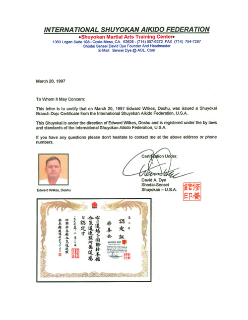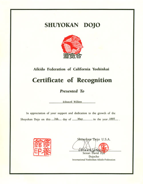 Certificate, Shuyokai Branch Dojo, Mar 20, 1997