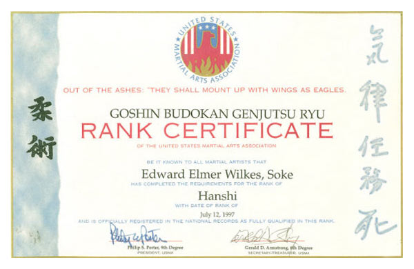 Hanshi Rank Certificate, Goshin Budokan Genjutsu Ryu, Jul 12, 1997