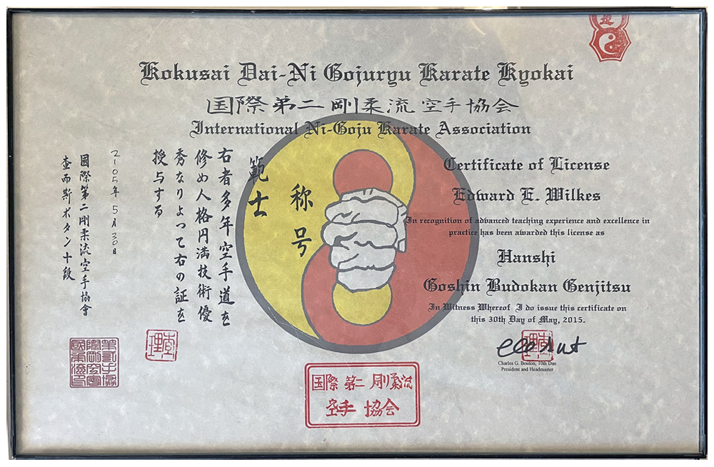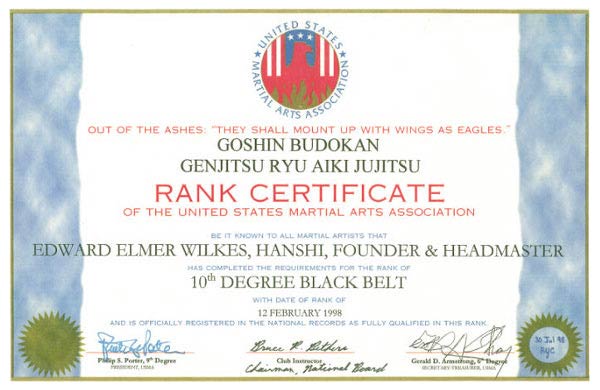 Hanshi, Founder and Headmaster Rank Certificate, Goshin Budokan, Genjitsu Ryu Aiki Jujitsu, Feb 12, 1998