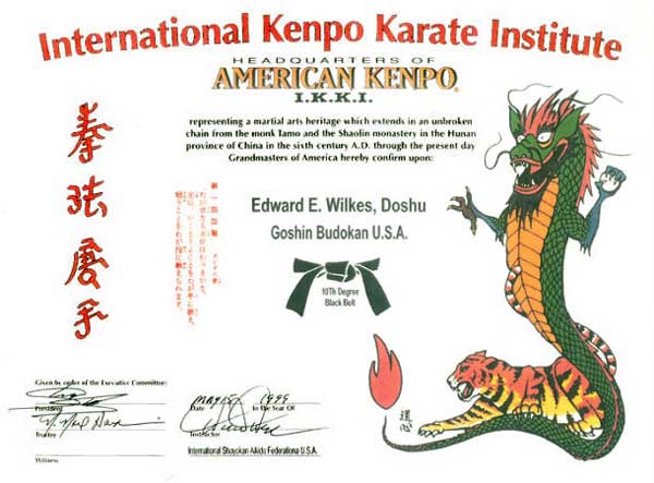 Degree Rank Certificate, Goshin Budokan U.S.A., May 15, 1999