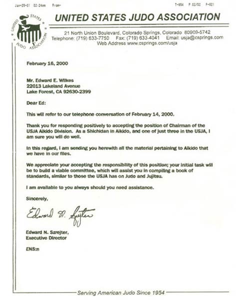 Letter confirming Doshu Wilkes as Chairman of the USJA Aikido Division, Feb 16, 2000