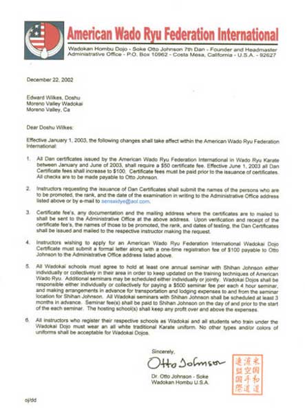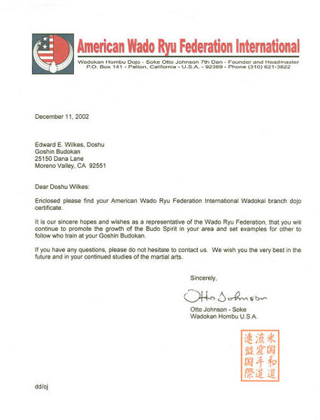 Letter from Soke Otto Johnson, accepting Doshu Wilkes' dojo as Wado Ryu branch dojo - Dec 11, 2002
