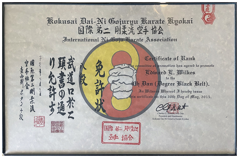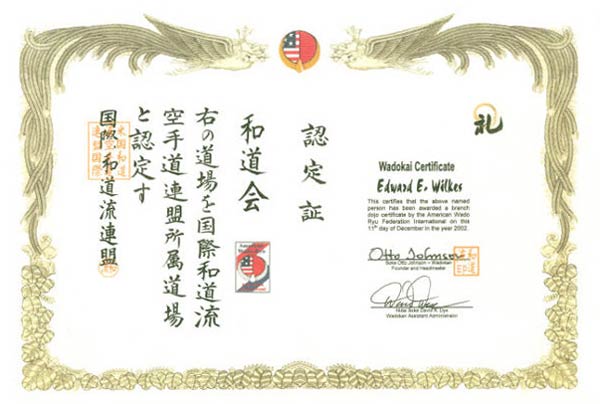 Certificate from Soke Otto Johnson, accepting Doshu Wilkes' dojo as Wado Ryu branch dojo - Dec 11, 2002