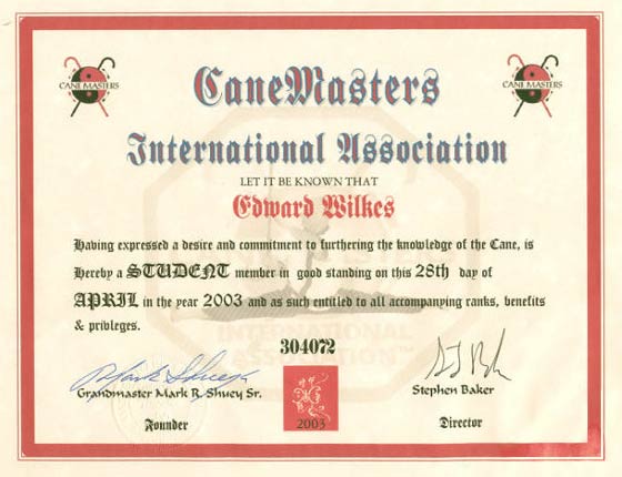 Certificate Establishing Doshu Wilkes as a Student Member in Good Standing, Apr 28, 2003