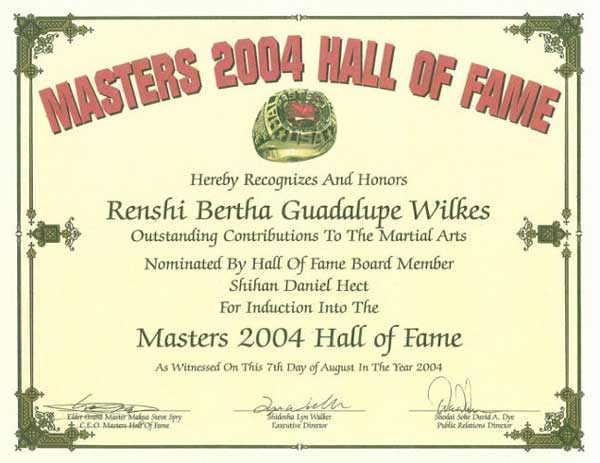 Renshi Bertha Guadalupe Wilkes - Outstanding Contributions to the Martial Arts Award and Induction into the Masters 2004 Hall of Fame