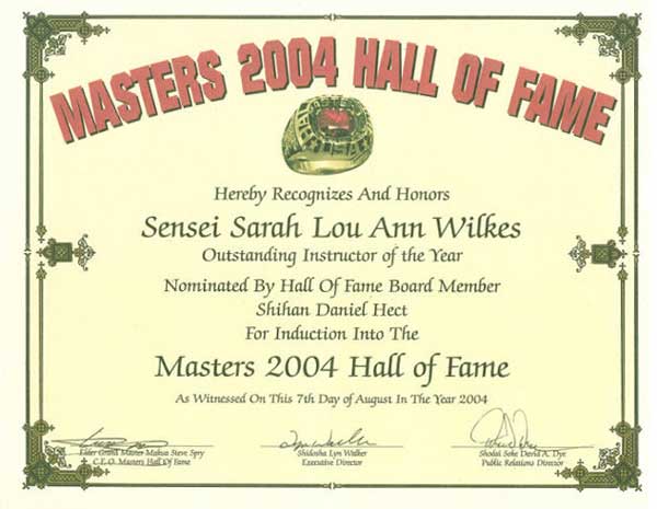 Sensei Sarah Lou Ann Wilkes - Outstanding Instructor of the Year Award and Induction into the Masters 2004 Hall of Fame