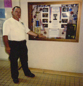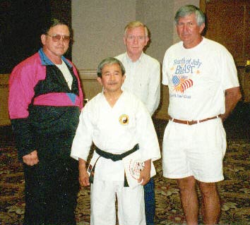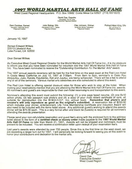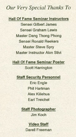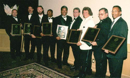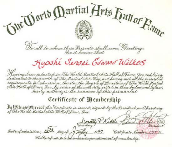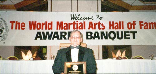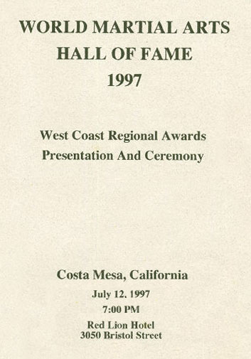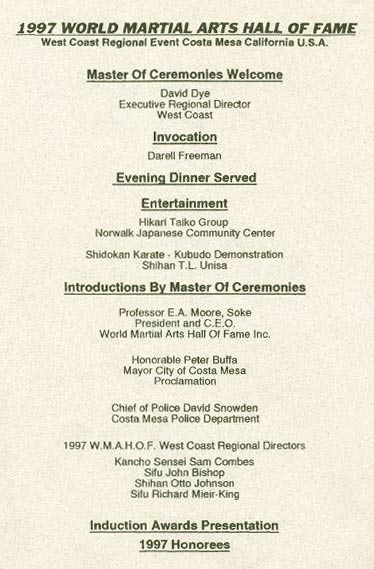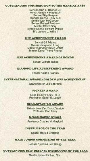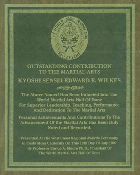 The group of inductees that had been awarded the Outstanding Contribution to the Martial Arts at the World Martial Arts Hall of Fame on July 12, 1997. Inductee are from left to right. Sensei John L. Bennett Jr., Kumu Joseph Kahapea Jr., Sensei Skip Koepke, Kancho Sensei Tony Kull, Sensei Dan McGeough, Sensei Ronald Reekers, Master Steve Spry, Kyoshi Sensei Edward E. Wilkes, Sifu James L. Willis II.